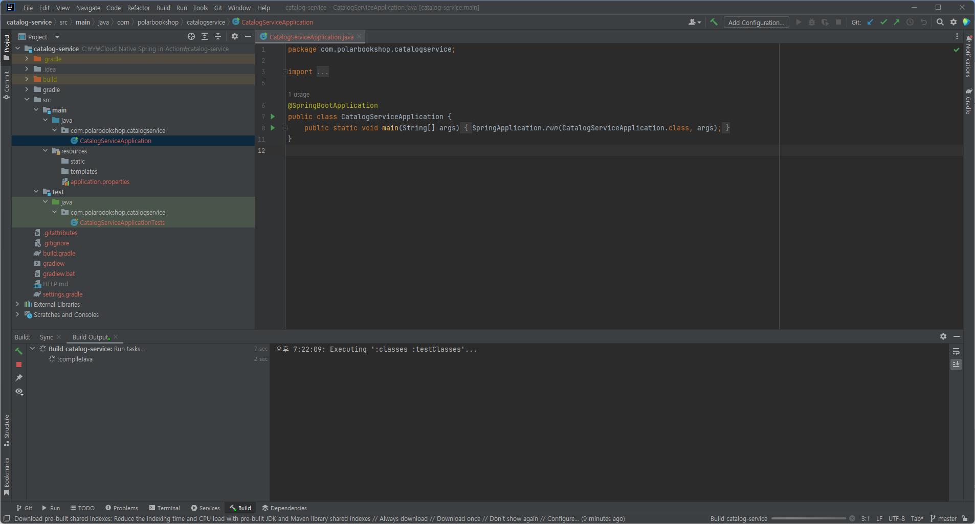 그리고 교재에 맞춰서 package를 한 단계 더 추가해 com.polarbookshop.catalogservice 로 만들어 메인 소스를 옮겨줬다.