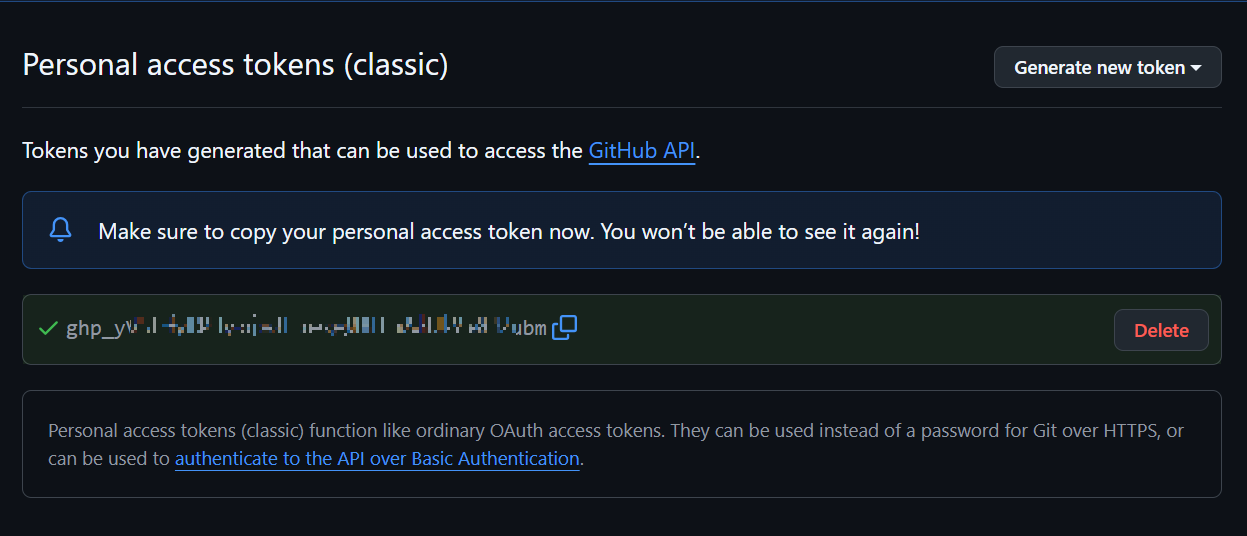 - "Generate new token (classic)" 버튼을 클릭