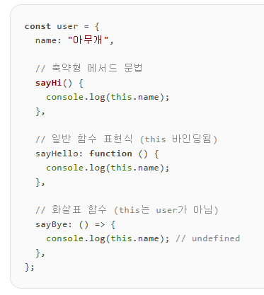 자바스크립트 함수 선언식과 표현식, 제대로 알고 쓰기 | 요즘IT자바스크립트에서 함수를 선언하는 방식은 크게 두 가지로 나눌 수 있습니다. 바로 ‘함수 선언식’과 ‘함수 표현식’이죠. 겉보기에는 큰 차이가 없어 보이지만, 실제로는 호이스팅 시점, 실yozm.wishket.com요즘 레터 읽다가 문득 this 에 대해서 한번 정리할까 싶어서 작성. 예시 코드에선 객체 안에 3가지 방식의 메서드(sayHi, sayHello, sayBye)가 정의되어 있고, 각각 다른 방식으로 this를 바인딩. 1. 축약형 메서드 문법sayHi() { console.log(this.name); // "아무개"} 여기서 this는 항상 해당 메서드를 호출한 객체 (user) 를 가리킨다.따라서 this.name === "아..