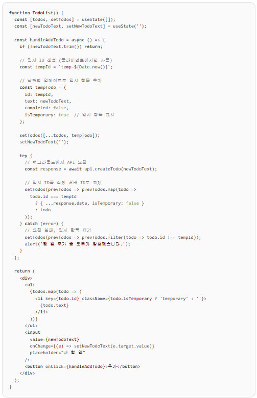 백엔드 속이는 프론트엔드 성능 최적화, ‘Optimistic UI’ | 요즘IT구글의 'INP(Interaction to Next Paint)' 지표는 사용자 인터랙션 후 화면 업데이트 속도를 측정합니다. 2024년 3월부터 구글은 INP를 Core Web Vitals의 공식 지표로 채택했습니다. 'Optimistic UI' 패턴은 이 INP 지yozm.wishket.com 위의 요즘레터 보다가 그냥 정리해봄.글 내용과는 상관없음. 소스만 참조..map() 함수.map()은 배열에서 각 요소를 순회하면서 변형한 새 배열을 만드는 함수. 예시const numbers = [1, 2, 3];const doubled = numbers.map(num => num * 2);console.log(doubled); /..